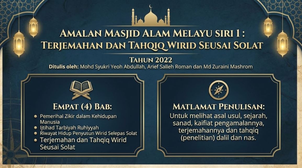 Buku yang berjudul Amalan Masjid Alam Melayu Siri 1 : Terjemahan dan Tahqiq Wirid Seusai Solat tahun 2022 ditulis oleh Mohd Syukri Yeoh Abdullah, Arief Salleh Roman dan Md Zuraini…